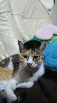 ミケ しっぽ長い 背中にハート型の黒い模様 人懐っこい ピンクの首輪鈴つき