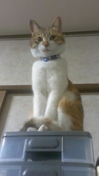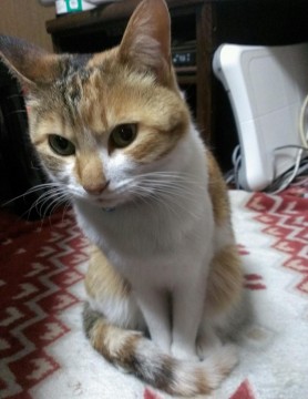 三毛猫、やせ気味、白地に星青いマークの首輪をつけていました。