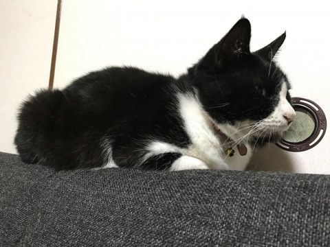 尻尾が短い。背後は黒猫。あごヒゲのような模様。足先は白。
