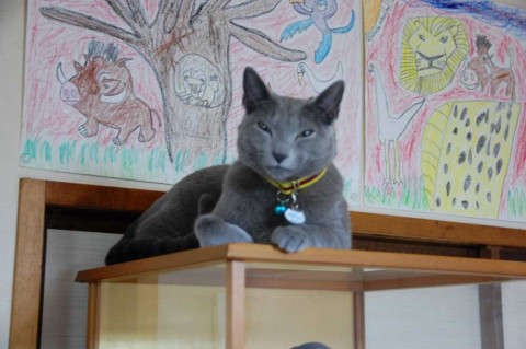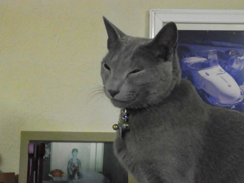 ロシアンブルーで灰色の毛並み 去勢済です えんじ色の首輪に迷子札付けています なき声はかなり大きいです