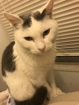 白にグレーのブチ模様。去勢済みの男の子。黒柄の首輪をしています。