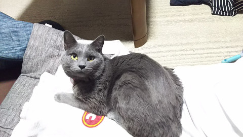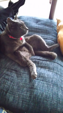 ロシアンブルーぽい全身グレーで、赤い首輪です。