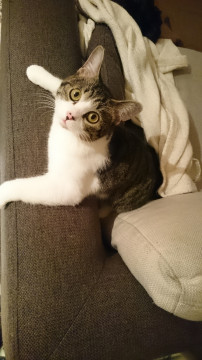キジトラ×白。八割れ白。お腹と胸と手足も白い。かぎしっぽ。小柄。♂。去勢済。黄緑のゴムで編んだ首輪を着けています。