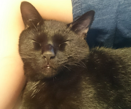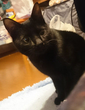 去勢済み、短い鍵尻尾、手足短め、小柄、左ヒゲ1本だけ白い、首輪なし、人見知り、臆病