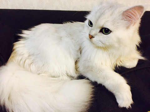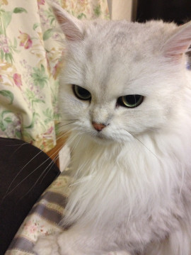 チンチラシルバーの白長毛、緑色の目をしています。