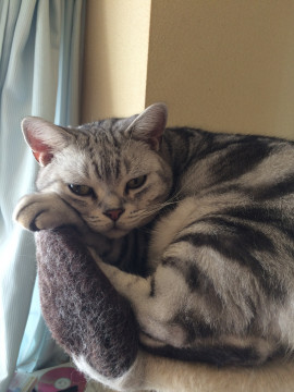 薄いグレーと黒のアメリカンショートヘアー。尻尾が長く青い首輪を付けいます。