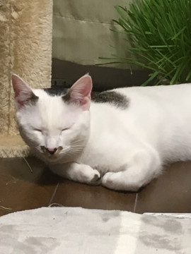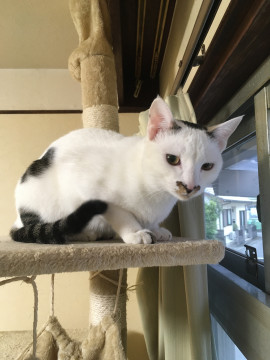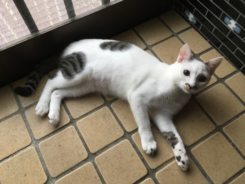 布製のピンクと白の首輪を付けていますが、首輪嫌がって自分で外してしまうこともあります。
