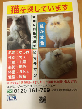 お陰様で、ゆっけを1月23日夕方4時頃、近所の家のウッドデッキの下で見つけました。無事に捕獲し、今ソファで寝ています。