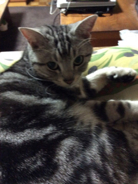 アメショーのシルバータビーの雄。体重は4キロ超です。首輪はつけていません。