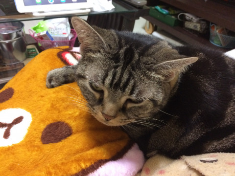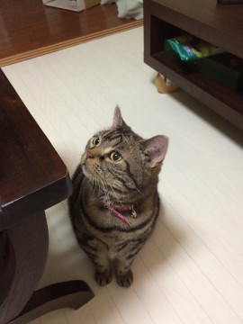 アメショーブラウンタビー ピンクにヒョウ柄の首輪をしています。