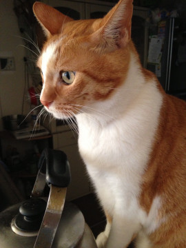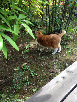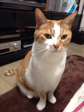 背中が茶トラ、お腹周りが真っ白い。ぽっちゃりしてるねこちゃんです。