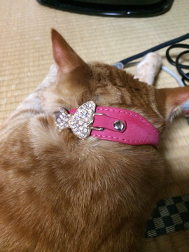 濃いピンク、スワロフスキー風のリボンの飾りがついた首輪をしています。