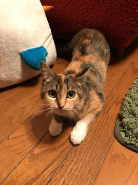 メスの三毛さび柄の猫です。まだ7ヶ月くらいなので体重が3KGで小柄です。