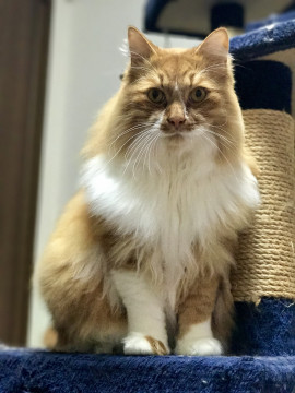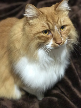 長毛、茶白。足先は白い。右前脚の先が少し茶色い。首輪はなし