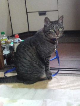 キジトラ 尻尾が長い ブルーのリードが付いたまま