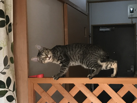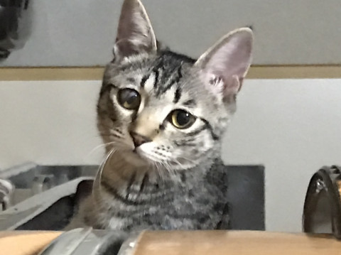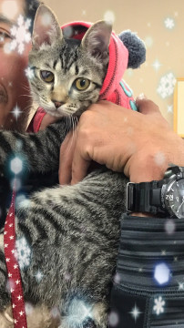 キジトラの女の子で右目の眼球にキズがあります。尻尾が短く鍵尻尾です。名東区香南。
