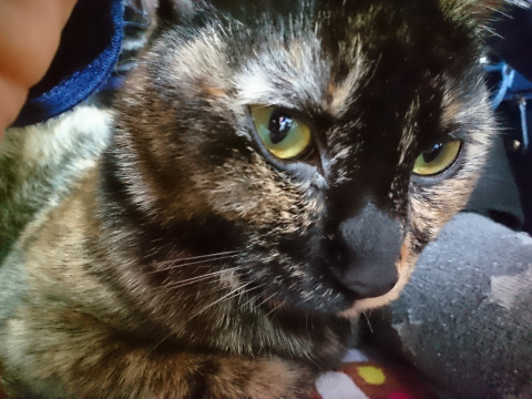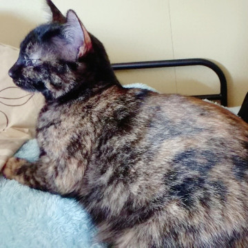 茶色と黒っぽいような灰色のような柄です。お腹がちょっとぽちゃっとしてます。