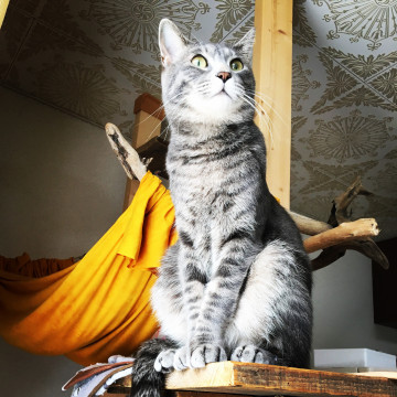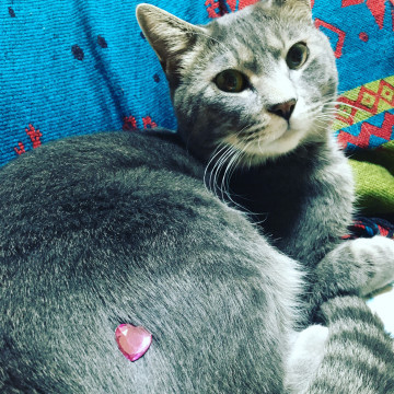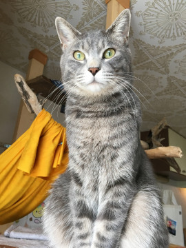 全身グレーのサバトラです。しっぽは真っ直ぐで何処も曲がっていません、去勢済みです。懐っこくマイペースな性格です。