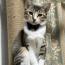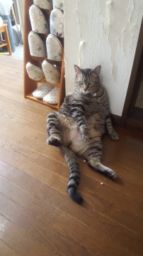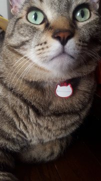 キジトラ、尻尾は長くまっすぐ、体重約6キロの太め。猫の形のピンクのチャーム付きピンクの首輪をしています。