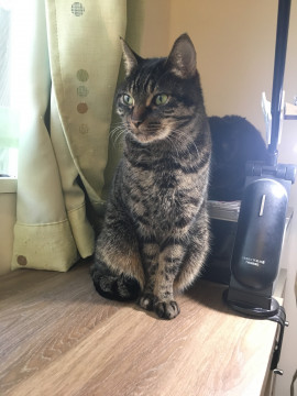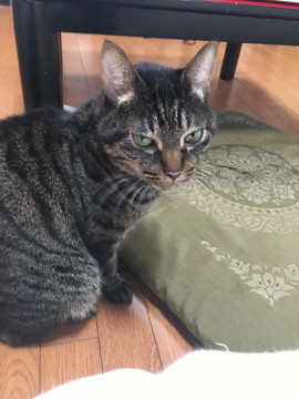 こげ茶に黒の縞(キジトラ)です。足が短く、オスですが声が高いです。