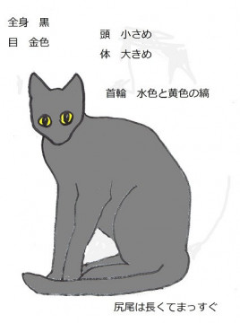 全身黒色、やや大柄、尻尾は長い、去勢済み