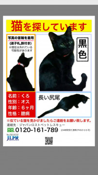 黒猫、シッポが細くて真っ直ぐで長い、首輪をに迷子カプセルと鈴付き(外れている可能性あります)