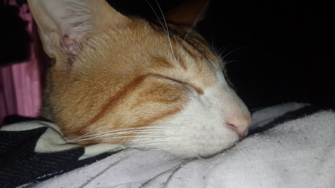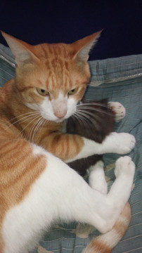 白×茶トラ。尻尾は長くまっすぐ。体は細身。声はしゃがれたような声。首輪2つ、布製青とビニール製ピンク地に白水玉。