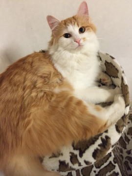 茶白の長毛猫で、首輪はありません。口の左側にボツっとひとつ模様があります。
