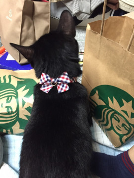 白地に赤と紺のチェックのリボンの首輪をしています。