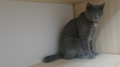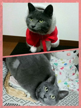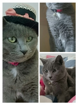 ロシアンブルーに似た毛色。首下とお腹の一部が白い。右脇腹に毛を刈り取った部分がある。鍵しっぽで短め。右耳先端部ギザ耳です。