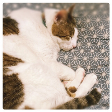 目を閉じると、目尻の黒い縞模様と繋がって、笑っているように見えます。