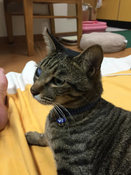 青い首輪をつけた人懐っこい日本ネコです。