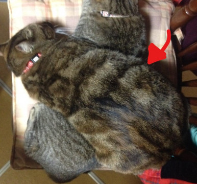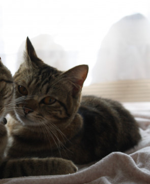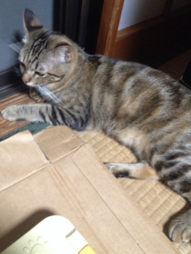 キジトラの女の子(避妊手術済)です。完全縞々ではなく横から見るとちょっとアメショの模様の様にも見えます。