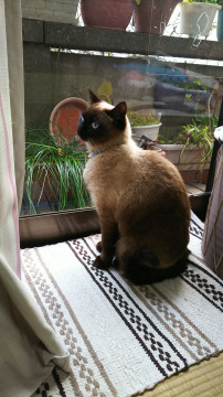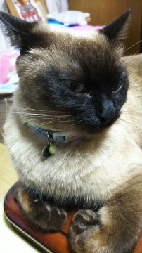 丸顔のシャム猫です。水色の首輪、迷子札をつけています。