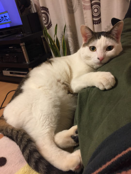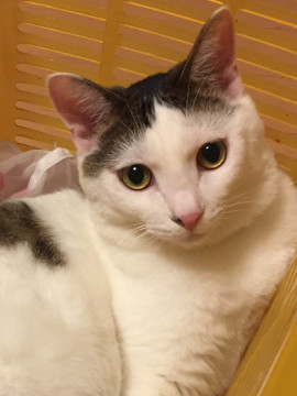 柄:白キジのハチワレ顔 脚も白 ピンクの鼻に黒のブチ入り