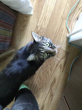 3/30から行方不明だった「ざらめ」ですが、5日夜、マンション3階の留守宅ベランダに潜んでいるのを発見、翌6日お隣の協力を得て無事、保護しました。脱水気味でしたがケガはなく、点滴補液してもらい要経過観察で帰宅。ガツガツ食べ、死んだように眠り、時々猛烈に甘えて、だいぶ体力回復しました。ご心配くださった皆さま、ありがとうございました。