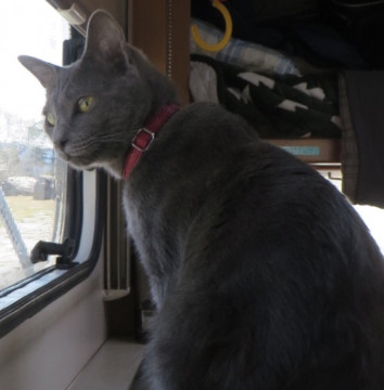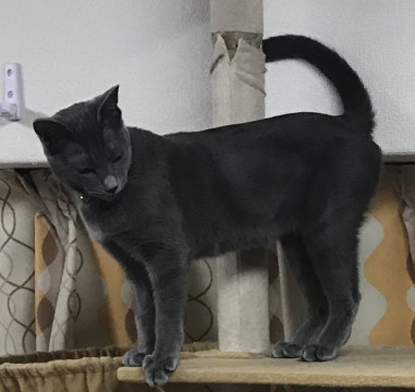 全体に青灰色のロシアンブルーっぽいオス猫で目は金(黄)色です。