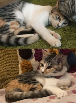 見た目は写真のとおり三毛猫ですが、シマになっていたり、写真がなくわかりずらいのですが、