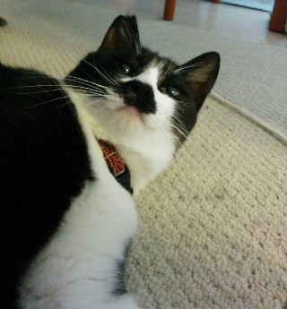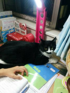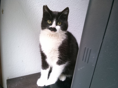 黒白模様で顔のちょびひげが特徴的な子です。右耳にVカットあり。尻尾長くて黒。首輪なし。鳴き声高い。もともとノラちゃんだったこが里子に出て完全室内飼いで一年過ごしています。臆病な子ですが、食いしん坊なので食べ物には食いつく可能性あり。