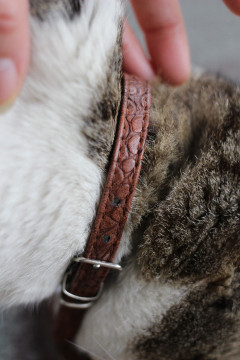 ・茶色の首輪アリ(型押しのようなゴム付安全首輪 鈴付き ネームタグなし)