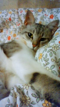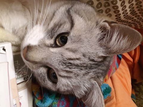グレーと白のキジトラです。グレー部分に茶色のぶちが少しあります。