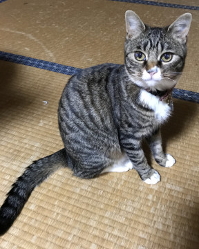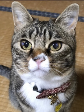 はずれていなければ、赤い和柄(麻の葉柄)の首輪をつけています。