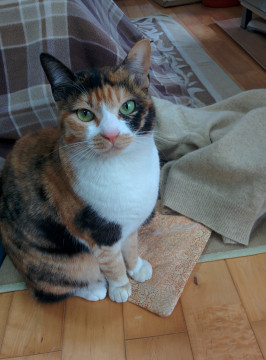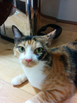 三毛猫,胸が白い。口の周りが茶色い。体重4~5キロ。避妊手術済。首輪はしていません。