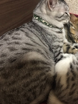 灰色のキジトラの男の子。緑の唐草模様のシュシュをつけてます。人見知りで臆病なので、自分から人に近づくことはあまりないと思います。