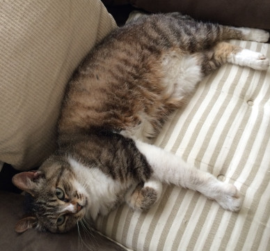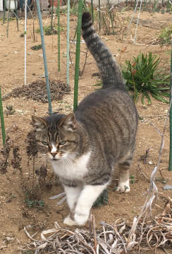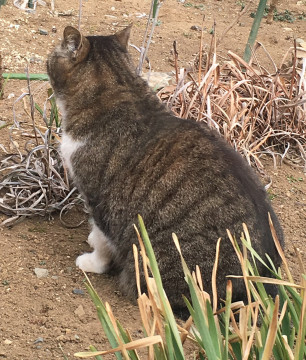 避妊済みメスのキジ柄で両手足、クビ、お腹、口元が白く尻尾はまっすぐで長いです。