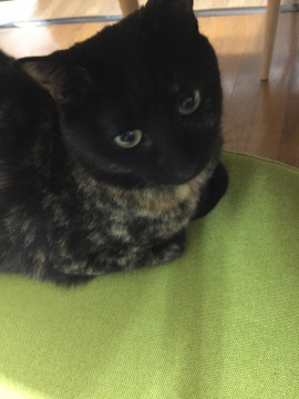 全体は黒で首元にベージュ色のマフラーのような毛。顔は黒 目はうすいグリーン。体に茶の点々があり シッポの先と右手の先はベージュ色が入ってます。