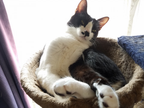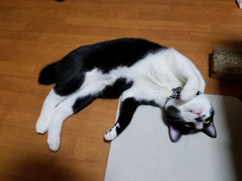 ハチワレのカギしっぽで、鼻の部分はチョビヒゲ模様(落書きのような模様)です。