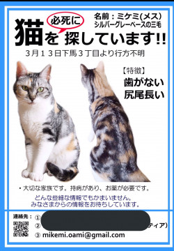 3月末から目撃情報もなくなりました。些細な事でもかまいません。よろしくお願い致します