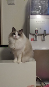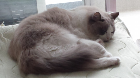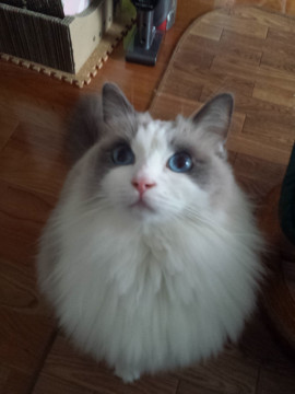猫種はラグトール。目はブルーで白地にグレーの長毛種。