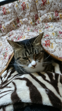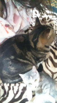 声の高いアメショ模様です。背中に十字架のようなもようがあります。